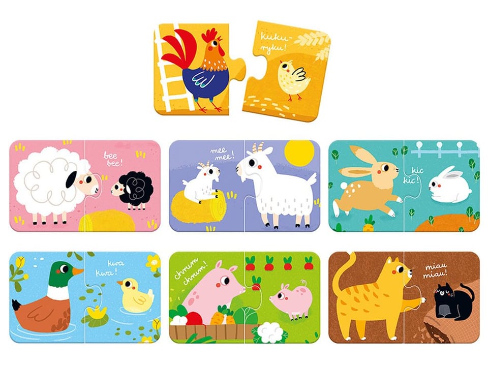 Hej, maluchy! Czy wiecie, jakie zwierzątka brykają w gospodarstwie? Puzzle do pary Zwierzątka z gospodarstwa to poręczny edukacyjny zestaw. Zawiera 7 soczyście kolorowych, dwuelementowych układanek, które przedstawiają małe i duże zwierzątka ze wsi. To świetny pomysł na pierwsze puzzle dla dzieci powyżej 1 roku życia. Bawcie się z nimi na wiele sposobów: