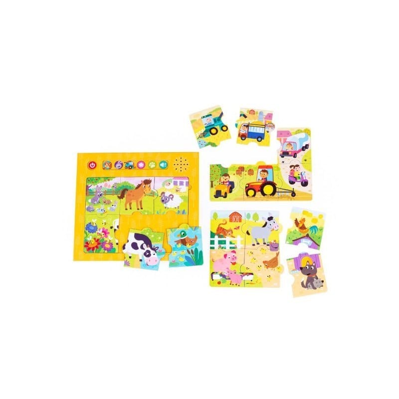 Puzzle Dźwięki wokół nas - Wieś Układaj puzzle, poznając przy tym zwierzątka mieszkające na wsi, na łące, a także maszyny rolnicze. W zestawie znajdziesz 18 dużych puzzli do ułożenia 3 obrazków oraz wygodną podkładkę z wytyczoną przestrzenią, sugerującą rozmiar obrazka, co ułatwia układanie. Na górze podkładki znajdują się przyciski, aktywujące różne tryby zabawy. Na malucha czekają zgadywanki, rozpoznawanie odgłosów zwierząt, a także wiele dźwięków i melodii. Cechy produktu: - 50 dźwięków i melodii; - 18 puzzli do ułożenia 3 obrazków; - 6 pomysłów na zabawę: 1) ułóż puzzle i aktywuj tryb, 2) podwórko, 3) łąka, 4) wiejskie pojazdy, 5) gra „Czyj to głos", 6) gra „Zgadywanki"; - podkładka ułatwiająca układanie; Baterie: 3 x LR44 (zawarte w zestawie) Wiek: 3+