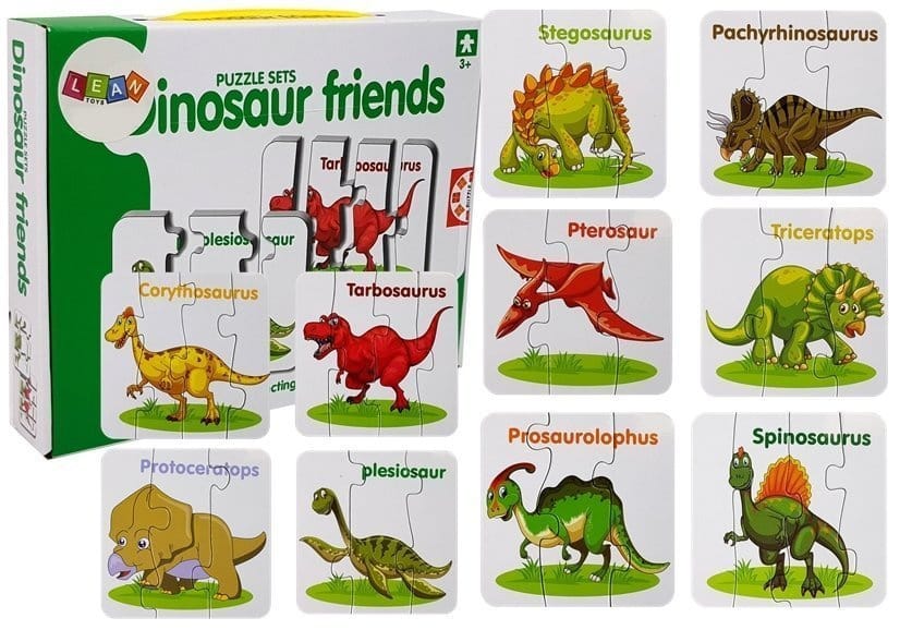 Łamigłówki edukacyjne będą dobrym ćwiczeniem dla wyobraźni, poszerzą wiedzę oraz ćwiczą cierpliwość. Całość będzie procentować w przyszłości u dziecka. Poprzez dopasowanie kształtów puzzli dowie się jaki rodzaje dinozaurów występowały w prehistorii. Każdy z gadów ma podpis w języku angielskim, dzięki czemu pozna nazwy w obcym języku. Z wszystkich puzzli można stworzyć aż 10 połączeń.