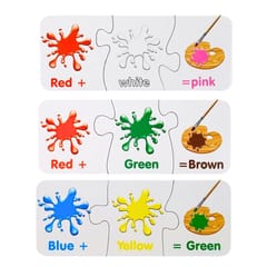 Łamigłówki edukacyjne będą dobrym ćwiczeniem dla wyobraźni, poszerzą wiedzę oraz ćwiczą cierpliwość. Całość będzie procentować w przyszłości u dziecka. Poprzez dopasowanie kształtów puzzli dowie się, z jakich połączeń barw powstają poszczególne kolory. Każdy z kolorów ma podpis w języku angielskim, dzięki czemu pozna podstawowe słówka. Z wszystkich puzzli można stworzyć aż 10 połączeń.