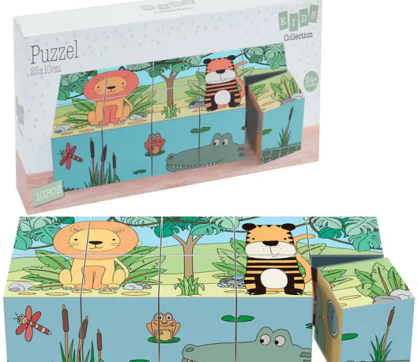 Puzzle klocki blokowe dla dzieci 10 puzzli Klocki puzzle do układania dla dzieci zwierzęta z kreskówek .10-częściowy zestaw puzzli dla dzieci łączy sześć puzzli w jeden zestaw klocków. Po każdej stronie układanki przedstawione są wesołe zwierzęta. Bloki klocki są wykonane z wytrzymałej tektury i są pakowane w poręczne kartonowe pudełko do przechowywania. Zalecany wiek: 24 miesiące +. Spełnia normy CE.Dane techniczne: Rozmiar każdego bloku ok. 5 x 5 cm, Norma CE, Wiek 24miesiecy+,