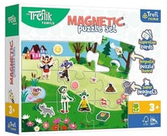 W zestawie: puzzle magnetyczne, dwa zestawy magnesów do przyczepienia na puzzle, 12 kart z inspiracjami do odtworzenia scenek.