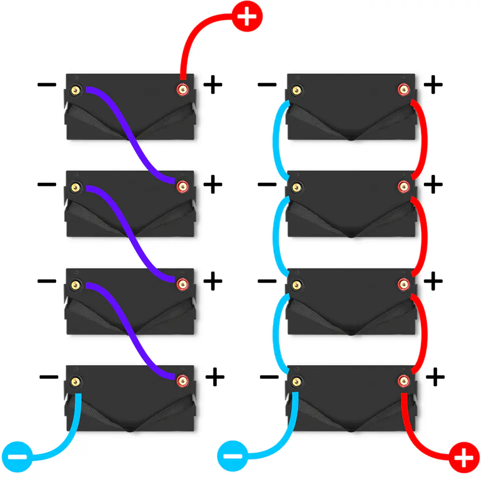 Nasze akumulatory LiFePO4 mogą być łączone szeregowo i równolegle. Jedynym warunkiem jaki należy spełnić by nie uszkodzić baterii, jest użycie akumulatora o tym samym napięciu, takiej samej pojemności i stopniu zużycia. Jeśli zależy nam na zwiększeniu napięcia musimy połączyć baterie szeregowo czyli (+) z (-). Natomiast chcąc zwiększyć pojemność, łączymy równolegle (+) z (+) i (-) z (-). Poniższe ilustracje przedstawiają w jaki sposób prawidłowo połączyć ze sobą akumulatory.