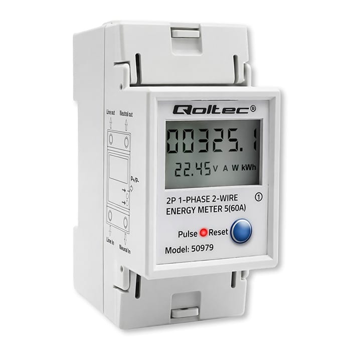 Qoltec Jednofazowy elektroniczny licznik zużycia energii na szynę DIN | RESET | licznik okresowy i stały | 230V | 60A | LCD | LED | 2P