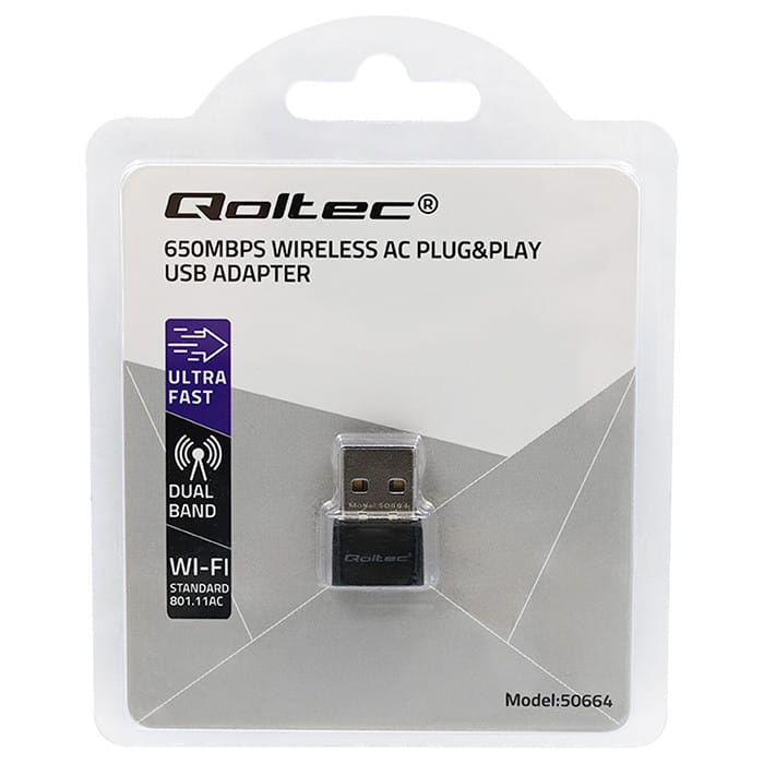Bezprzewodowy mini adapter Wi-Fi marki Qoltec został zaprojektowany z myślą o możliwości podłączenia do sieci urządzeń nie posiadających karty sieciowej lub korzystających z jej starszej wersji. To najlepsze rozwiązanie dla potrzeb bezprzewodowych. Ciesz się szybkim Internetem na dowolnym urządzeniu, w dowolnym miejscu i czasie. Nasze rozwiązanie oferuje:- obsługę standardów a / b / g / n / ac - wtyk USB 2.0 – pozwala na bezpośrednie podłączenie adaptera do urządzeń wyposażonych w port USB,- obsługę dwóch pasm częstotliwości – 2,4 oraz 5.8 GHz - to streaming wideo oraz oglądanie filmów w jakości 4K czy granie w gry przy zachowaniu możliwie jak najwyższej jakości połączenia - transmisję danych z prędkością 650Mbps,- wbudowana wewnętrzna antena 2dBi,- kompatybilność z systemami Windows 7, 8, 8.1, 10 i 11.- kompaktowe wymiary idealne do codziennego użytkowania.