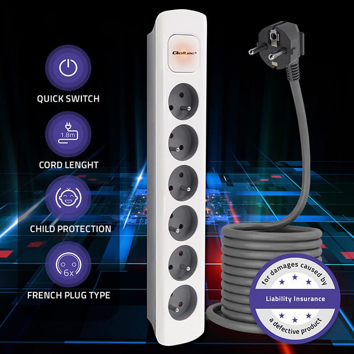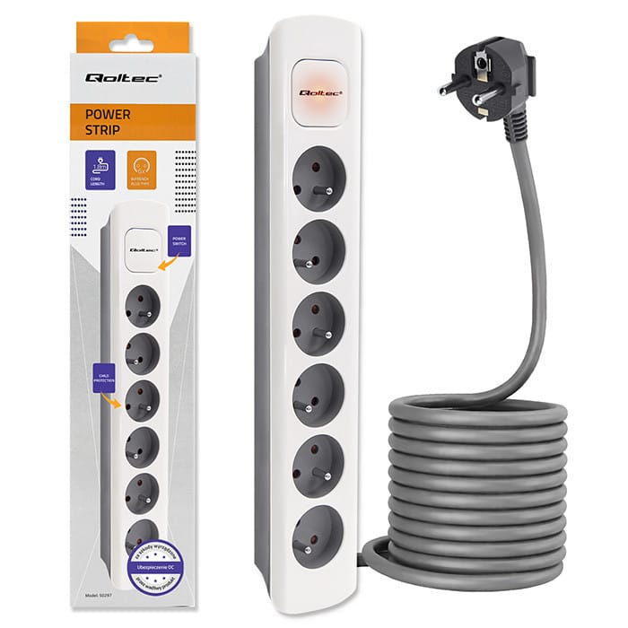 Qoltec Listwa zasilająca | 6 gniazd | 1.8m | Biało-szara 0NC