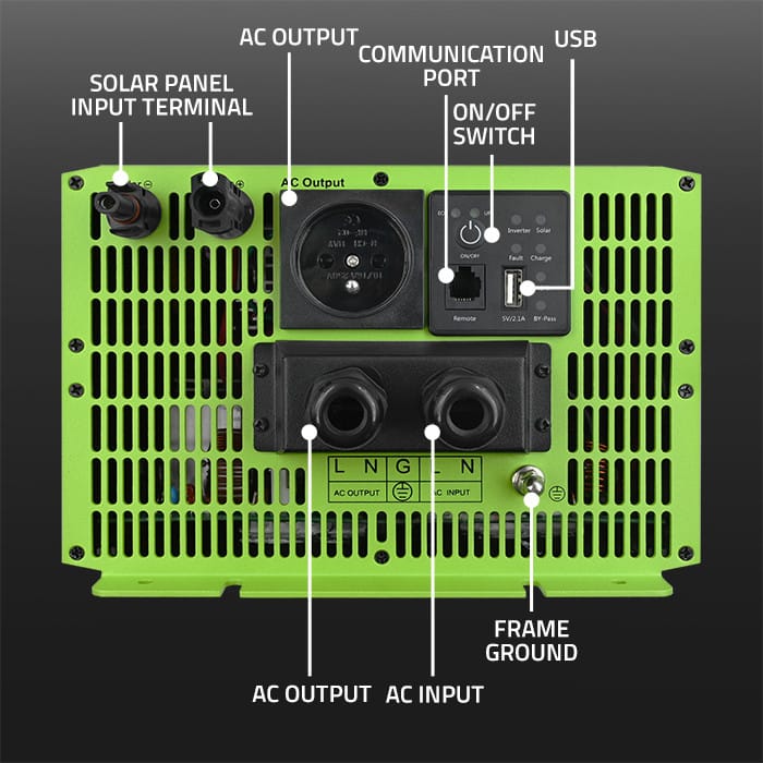 Dzięki wbudowanemu systemowi ATS, urządzenie automatycznie przełącza się między zasilaniem sieciowym a energią słoneczną, zapewniając nieprzerwaną dostawę energii. •Funkcja UPS – w przypadku zaniku prądu z sieci, urządzenie automatycznie przełącza się na zasilanie z akumulatora, zapewniając ciągłość pracy podłączonych urządzeń.•Funkcja ATS – automatycznie wybiera między zasilaniem z sieci a energią z paneli słonecznych, w zależności od dostępności.•Podwójny tryb ładowania – urządzenie może ładować akumulator zarówno z gniazdka 230V (AC) prądem do 10A, jak i z paneli słonecznych za pomocą wbudowanego kontrolera MPPT z maksymalnym prądem 40A, który optymalizuje wykorzystanie energii słonecznej.