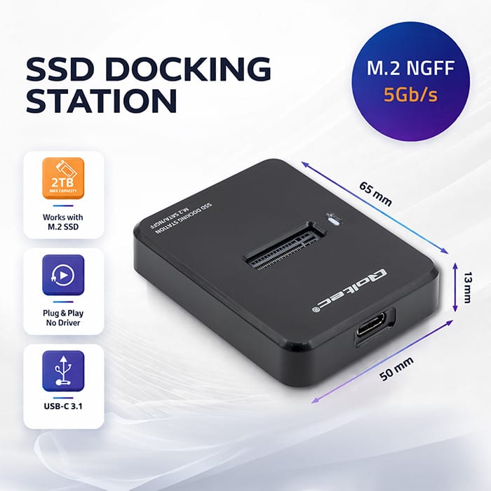 Przenośna Stacja dokująca marki Qoltec pozwala na podłączenie dysku SSD do gniazda M.2 SATA a następnie za pomocą złącza USB C 3.1 do wybranego urządzenia elektronicznego. Stacja współpracuje z takimi urządzeniami jak TV, komputer, laptop, konsola do gier, router.
