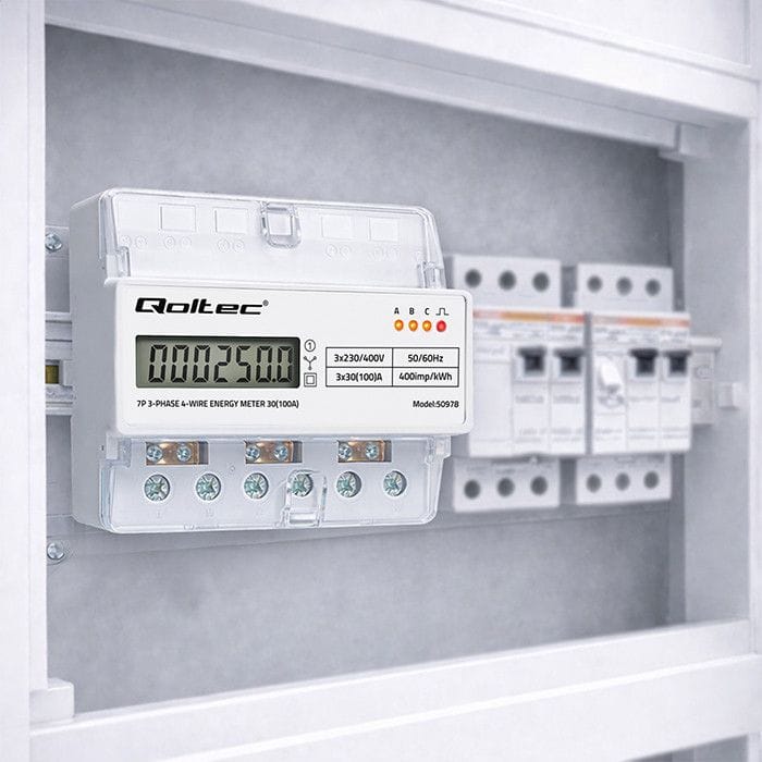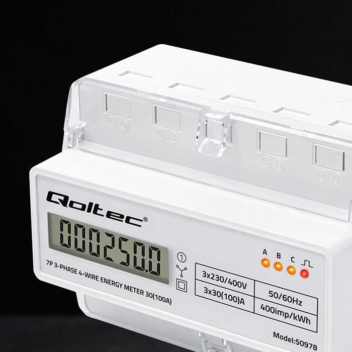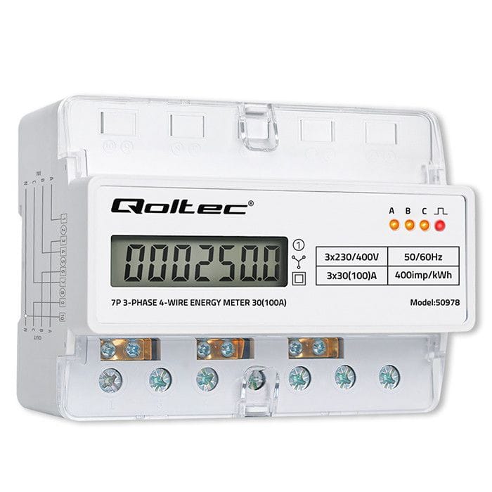 Qoltec Trójfazowy elektroniczny licznik | miernik zużycia energii na szynę DIN | 400V | 100A | LCD | LED | 7P