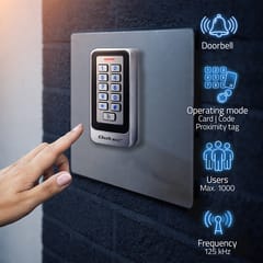 Prezentowany model składa się z podświetlanej cyfrowej klawiatury, dzwonka oraz czytnika kart zbliżeniowych i breloków.