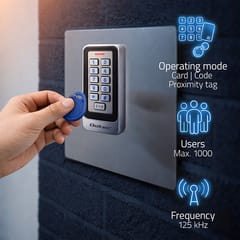 Prezentowany model składa się z podświetlanej cyfrowej klawiatury oraz czytnika kart zbliżeniowych i breloków.
