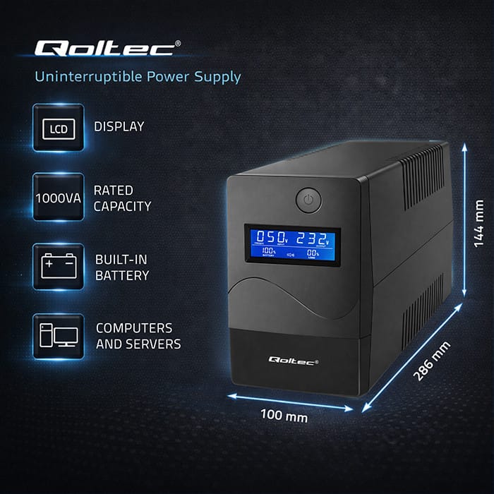 QOLTEC ZASILACZ AWARYJNY UPS 1000VA | 600W | LCD | USB | RJ45