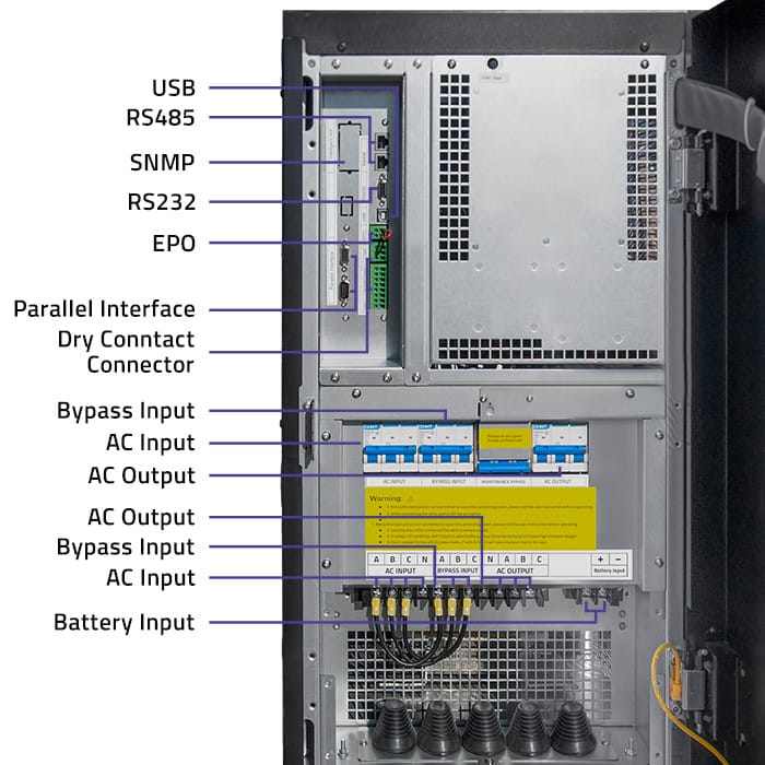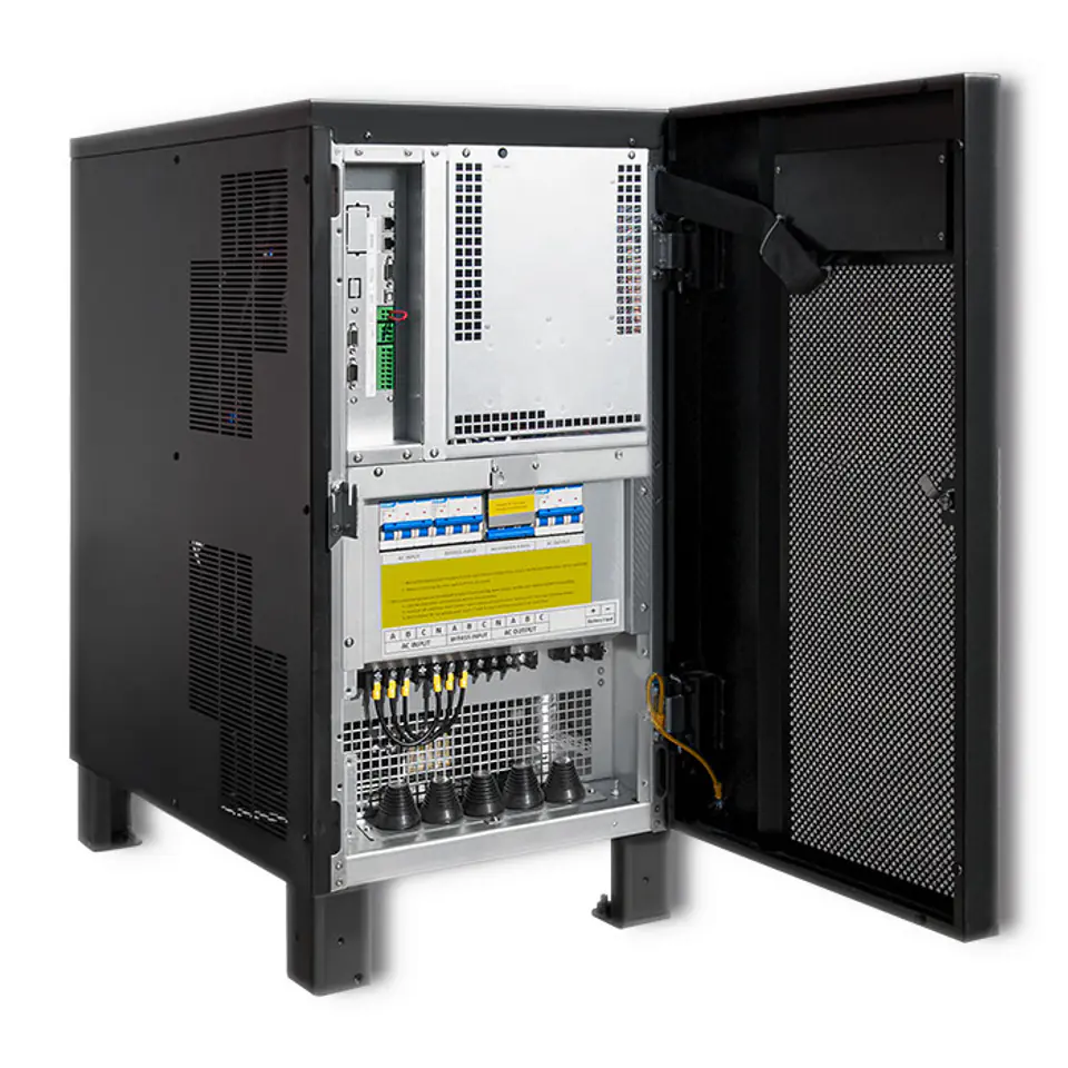 Prezentowany model UPS’a wyposażony jest w trój-poziomową topologię falownika tym samym zapewnia wysoką sprawność w trybie liniowym oraz w trybie ECO. Zaawansowany UPS przemysłowy dostarcza czystą energię elektryczną o sinusoidalnym kształcie oraz gwarantuje bezpieczeństwo wszystkim podłączonym urządzeniom.