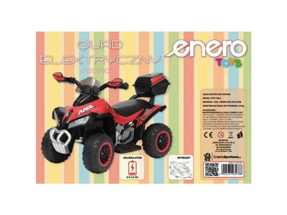 Dzięki niewielkim gabarytom, quad zmieści się w mieszkaniu, pokona alejki w parku lub na placu zabaw. Pojazd zaprojektowano dla dzieci powyżej 3 lat, co zapewnia wygodę najmłodszym użytkownikom. Dzięki temu, że jest elektryczny porusza się bardzo cicho i nie wywołuje emisji spalin , więc jest ekologiczny i bezpieczny dla dzieci. Minimalny poziom hałasu podczas jazdy z pewnością docenią wszyscy sąsiedzi. Wesoły czas przejażdżki umili Twojemu dziecku muzyka, wydobywająca się po każdorazowym naciśnięciu czerwonego guzika. Wraz z 3 różnymi melodyjkami migają światła LED w przednich lampach pojazdu. Specjalny przycisk PRZÓD,TYŁ I STOP aktywowany czerwonym pedałem pozwala dziecku na wybór kierunku jazdy. Dołączony akumulator zapewni stały poziom naładowania baterii, a tym samym dostęp do wszystkich dźwięków, efektów świetlnych i co najważniejsze do możliwości poruszania się. QUAD ELEKTRYCZNY MICRON z pewnością zadowoli każdego, nawet wybrednego malucha! Parametry:- Wymiary: 78.5 x 40.5 x 46 cm (dł. x szer. x wys.)Wymiary kuferka: 10 x 17 x 17 cm (wys. x szer. x gł.)Wymiary siedzenia: 28 x 15,5 x 4,5 cm (dł. x szer. x wys.)Wymiar kółka: 18 x 7,5 cm (śr. x szer.)Wymiar kierownicy: 40 cm (szer.)Wymiar rączek w kierownicy: 7 x 2,5 (szer. x śr.)Kolor: Czerwony, czarnyINPUT: 110- 240 VSilnik: 380WAkumulator: pojemność 6 V 4,5 AhZalecany wiek: Dzieci w wieku powyżej 3 latWaga maksymalna użytkownika: 20 kgPrędkość: 3 km/hCzas ładowania: 8-12 godzin / PRACA: 1-2 GODZ.Baterie pilota: BRAK PILOTAŁadowarka: DC6V500mAOpakowanie: 64 x 35 x 29,5 cm (karton)Waga netto : 4,960 kgWaga brutto : 5,800 kgMarka: ENERO