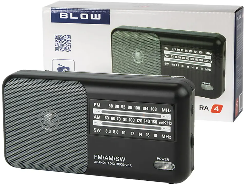 Przenośne radio FM Blow RA4 odbiera w częstotliwościach AM i FM – pozwala odtwarzać muzykę z wybranej stacji radiowej. Radio zostało także wyposażone w obrotową antenę teleskopową oraz potencjometr regulacji głośności.