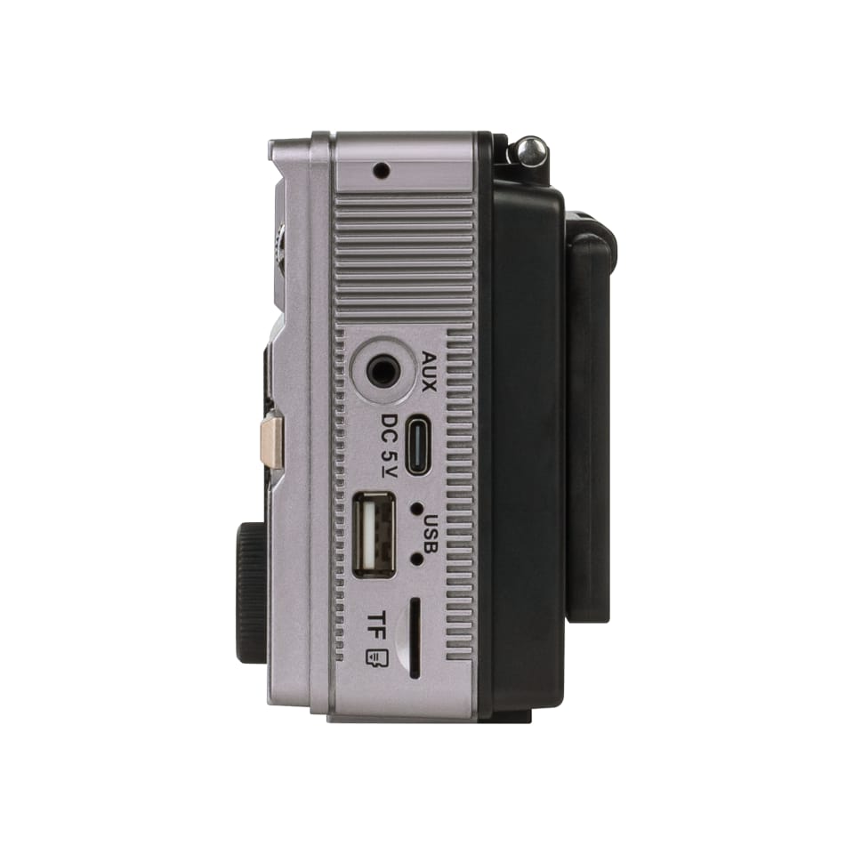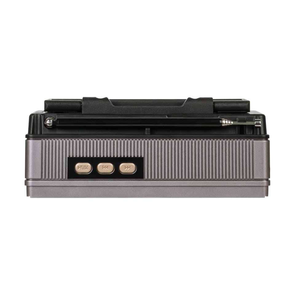 ----------GŁÓWNE CECHY----------Antena teleskopowaSkładany panel solarnyWskaźniki LEDPasek do przenoszenia----------DANE TECHNICZNE----------Częstotliwość radiowa: • AM: 510 – 1730 kHz • FM: 87 – 108 MHz • SW: 7,8 – 16,2 MHzGłośnik: 2,25” (57 mm)Impedancja: 4 OhmMoc wyjściowa: 3 WBluetooth 6.0Zakres częstotliwości Bluetooth: 2402 - 2480 MHzMaks. moc wyjściowa Bluetooth: 90 dBWejścia: • Wejście AUX (jack 3,5 mm) • Slot na kartę microSD (maks. 64 GB) • Wejście USB-A • Wejście USB-C (ładowanie)Czas pracy na jednym ładowaniu: do 150 minutCzas ładowania: do 3 godzinAkumulator: 18650, 3,7 V; 1200 mAhPobór mocy: 6 WZasilanie: 5 V / 1 AWaga: 379 gWymiary: 145 x 60,9 x 96,4 mmW zestawie: kabel USB-C (61 cm)