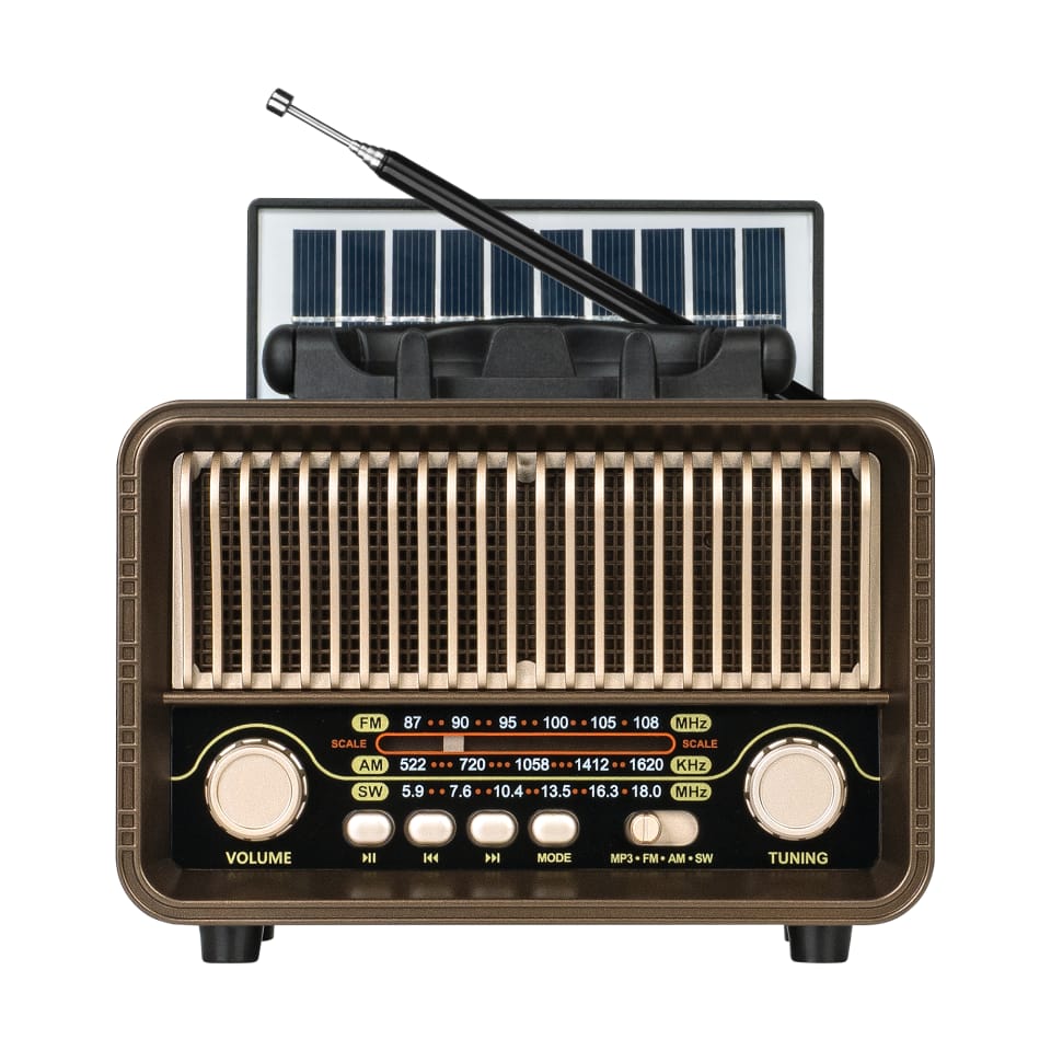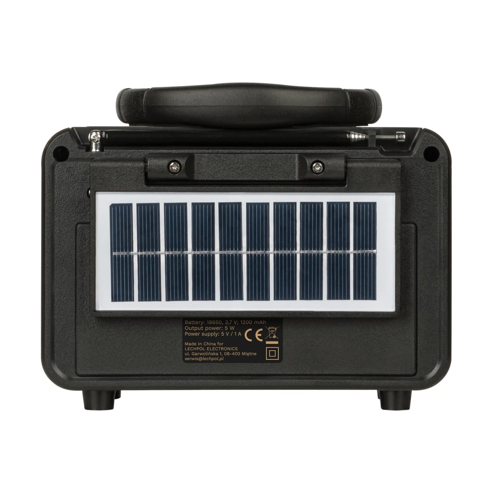 ----------GŁÓWNE CECHY----------Antena teleskopowaSkładany panel solarnyWskaźniki LEDUchwyt na smartfonaSkładany uchwyt do przenoszenia----------DANE TECHNICZNE----------Częstotliwość radiowa: • AM: 522 – 1620 kHz • FM: 87 – 108 MHz • SW: 5,9 – 18 MHzGłośnik: 2,5” (63,5 mm)Impedancja: 2 OhmMoc wyjściowa: 5 WBluetooth 6.0Zakres częstotliwości Bluetooth: 2402 - 2480 MHzMaks. moc wyjściowa Bluetooth: 90 dBWejścia: • Wejście AUX (jack 3,5 mm) • Slot na kartę microSD (maks. 64 GB) • Wejście USB-A • Wejście USB-C (ładowanie)Czas pracy na jednym ładowaniu: do 220 minutCzas ładowania: do 3 godzinAkumulator: 18650, 3,7 V; 1200 mAhDodatkowe źródło zasilania: 2 x bateria LR20 (brak w zestawie)Pobór mocy: 6 WZasilanie: 5 V / 1 AWaga: 585 gWymiary: 166 x 87,5 x 130 mmW zestawie: kabel USB-C (64 cm)