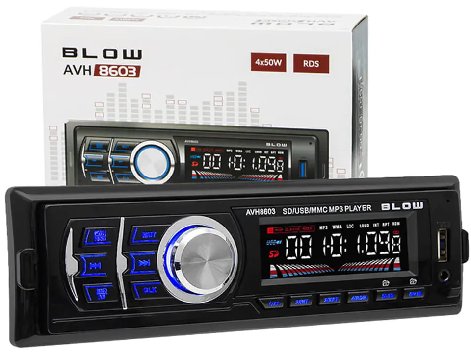 Radioodtwarzacz samochodowy marki Blow. Radio FM plus możliwość odtwarzania z nośników zewnętrznych typu karty pamięci SD czy pendrive USB
