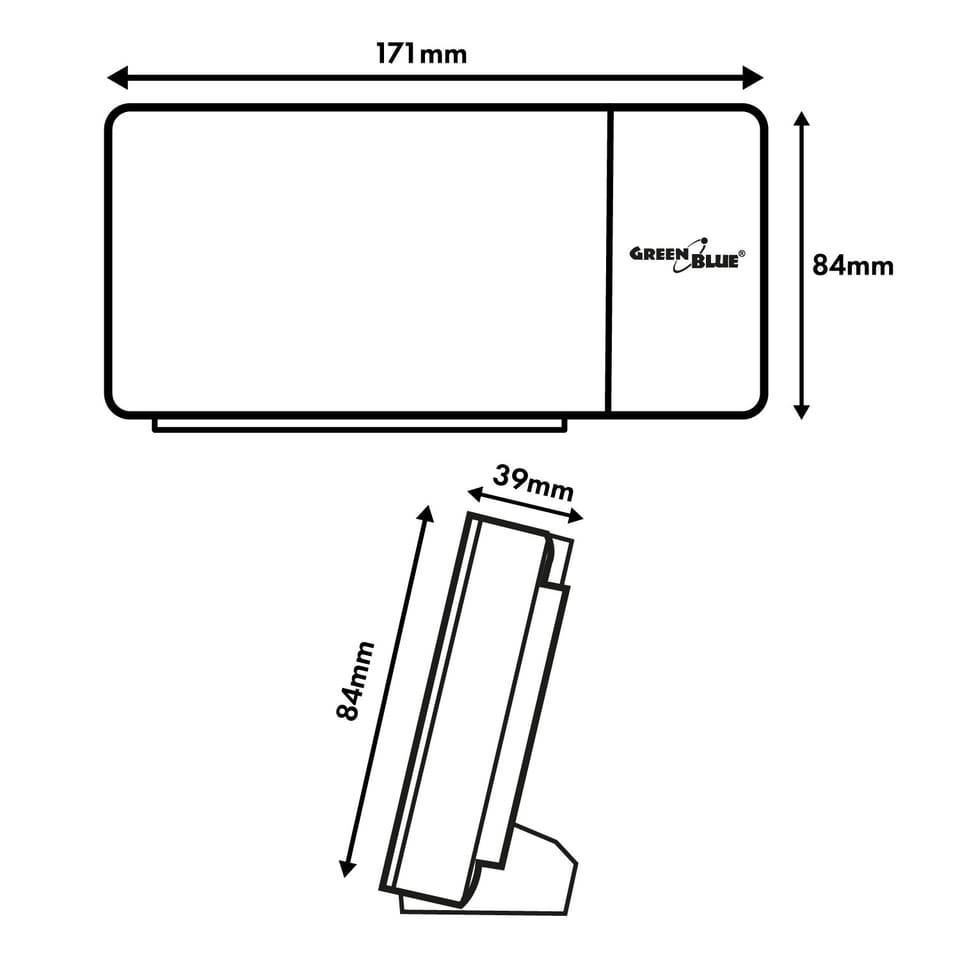 Specyfikacja- Producent: GreenBlue- Model: GB172- Kolor: czarny- Rodzaj wyświetlacza: LED- Format czasu: 12 / 24 godziny- Funkcja codziennego budzika: sygnałem dźwiękowym lub stacją radiową- Funkcja drzemki: regulowana 5–60 minut z możliwością wyłączenia- Zakres częstotliwości radia FM: 87,5 MHz – 108,0 MHz- Automatyczne wyszukiwanie stacji radiowych: tak- Regulacja jasności cyfr: 3 poziomy (możliwość wyłączenia)- Regulacja jasności projektora: 2 poziomy (możliwość wyłączenia)- Regulacja nachylenia projektora: 180°- Zasilanie USB: DC5V (prąd wejściowy większy niż 500mA)- Bateria podtrzymująca pamięć: 3,0V CR2032 (w zestawie)- Wymiary: 171 x 84 x 39 mm- Długość kabla zasilającego: ok. 150 cm