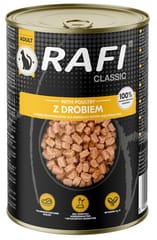 Rafi Classic - karma dla dorosłych kotówKarma wytwarzana przez Zakład Produkcji Karmy dla Zwierząt "Dolina Noteci"Karmy Rafi Cat to pełnoporcjowe karmy dla dorosłych kotów, które posiadają odpowiednio skomponowany skład spełniający ich wszystkie specyficzne wymagania żywieniowe. Najważniejszymi ich walorami są podstawowe surowce: mięso i produkty pochodzenia zwierzęcego oraz ryby i produkty rybne, które są źródłem wysokiej jakości białka. Karmy są produktami o optymalnej zawartości tłuszczu będącego źródłem naturalnie występującego w mięsie i produktach pochodzenia zwierzęcego kwasu arachidonowego – niezbędnego do prawidłowego funkcjonowania organizmu kotów. Dodatkowo surowce mięsne są naturalnymi źródłami kwasów z rodziny n-6, a dodatek do karm tauryny pokrywa fizjologiczną normę, dzięki czemu proces trawienia tłuszczu i białek zachodzi w sposób prawidłowy. Odpowiedni stosunek wapnia do fosforu przyczynia się do utrzymania prawidłowej homeostazy tych pierwiastków w organizmie i zachowania mineralizacji kości na stałym poziomie.Skład: mięso i produkty pochodzenia zwierzęcego 56% w kawałkach (w tym 8% drobiu)*, zboża, ryby i produkty rybne, substancje mineralne, cukry. * Kawałki zwykle stanowią ±48% w produkcie gotowym.Dodatki na 1 kg:Witamina A – 1100 IU, Witamina D3 – 100 IU, Witamina E – 15 mg, Cynk (jednowodny siarczan cynku) – 10 mg, Mangan (tlenek manganu (II)) – 2,5 mg, Miedź (pentahydrat siarczanu miedzi (II)) – 1,2 mg, Jod (bezwodny jodan wapnia) – 0,2 mg, Tauryna – 520 mg. Składniki analityczne: białko surowe – 7%, tłuszcz surowy – 4%, popiół surowy – 3%, włókno surowe – 0,5%, wilgotność – 81,5%.Dawkowanie: