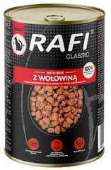 Rafi Classic - karma dla dorosłych kotówKarma wytwarzana przez Zakład Produkcji Karmy dla Zwierząt "Dolina Noteci"Karmy Rafi Cat to pełnoporcjowe karmy dla dorosłych kotów, które posiadają odpowiednio skomponowany skład spełniający ich wszystkie specyficzne wymagania żywieniowe. Najważniejszymi ich walorami są podstawowe surowce: mięso i produkty pochodzenia zwierzęcego oraz ryby i produkty rybne, które są źródłem wysokiej jakości białka. Karmy są produktami o optymalnej zawartości tłuszczu będącego źródłem naturalnie występującego w mięsie i produktach pochodzenia zwierzęcego kwasu arachidonowego – niezbędnego do prawidłowego funkcjonowania organizmu kotów. Dodatkowo surowce mięsne są naturalnymi źródłami kwasów z rodziny n-6, a dodatek do karm tauryny pokrywa fizjologiczną normę, dzięki czemu proces trawienia tłuszczu i białek zachodzi w sposób prawidłowy. Odpowiedni stosunek wapnia do fosforu przyczynia się do utrzymania prawidłowej homeostazy tych pierwiastków w organizmie i zachowania mineralizacji kości na stałym poziomie.Skład: mięso i produkty pochodzenia zwierzęcego 56% w kawałkach (w tym 8% wołowiny)*, zboża, ryby i produkty rybne, substancje mineralne, cukry. * Kawałki zwykle stanowią ±48% w produkcie gotowym.Dodatki na 1 kg:Witamina A – 1100 IU, Witamina D3 – 100 IU, Witamina E – 15 mg, Cynk (jednowodny siarczan cynku) – 10 mg, Mangan (tlenek manganu (II)) – 2,5 mg, Miedź (pentahydrat siarczanu miedzi (II)) – 1,2 mg, Jod (bezwodny jodan wapnia) – 0,2 mg, Tauryna – 520 mgSkładniki analityczne: białko surowe – 7%, tłuszcz surowy – 4%, popiół surowy – 3%, włókno surowe – 0,5%, wilgotność – 81,5%.Dawkowanie: