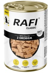 Linia Rafi Classic to pełnoporcjowe karmy dla dorosłych psów wszystkich ras. Odpowiednio skomponowany skład spełnia specyficzne wymagania żywieniowe psów dorosłych. Produkty te zawierają optymalną ilość tłuszczu oraz kwasów tłuszczowych (m.in. n-3, n-6) naturalnie występujących w mięsie i produktach pochodzenia zwierzęcego. Właściwy stosunek wapnia do fosforu w karmie przyczynia się do utrzymania prawidłowej homeostazy tych pierwiastków w organizmie psa i utrzymania mineralizacji kości na stałym poziomie. Dodatek surowców pochodzenia roślinnego dostarcza łatwostrawnych składników energetycznych w ilościach koniecznych dla odpowiedniego przebiegu procesów metabolicznych. Surowce te wraz z odpowiednio dobraną, niezmniejszającą strawności składników ilością włókna pokarmowego, zapewniają prawidłową stymulację procesów trawiennych i regulację wypróżnień. Stały skład surowcowy karm RAFI Classic gwarantuje niezmienną zawartość składników odżywczych, a przestrzeganie proponowanych przez producenta ilości podawanej karmy gwarantuje prawidłowy stan odżywienia psa.Mokre karmy dla psów Rafi Classic to w pełni zbilansowany, smakowity pokarm, dostarczający odpowiedniej ilości witamin i minerałów.Pełnoporcjowa, pokrywająca zapotrzebowanie na wszystkie składniki odżywcze, mokra karma dla psów wszystkich ras Rafi Classic zawiera: