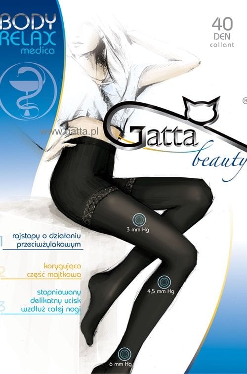- Innowacyjne rajstopy o działaniu przeciw żylakowym. Zdecydowanie ułatwiają i polepszają krążenie krwi.Zmienny, delikatny ucisk wzdłuż całych nóg zapobiega zmęczeniu i opuchliźnie.Część majteczkowa korygująca, modelująca, wyszczuplająca.Bezuciskowa gumka.Szczególnie polecane podczas prac wymagających długiego siedzenia lub stania. Wybierz technologię przyszłości!Marka Gatta. Grubość 40 DEN.