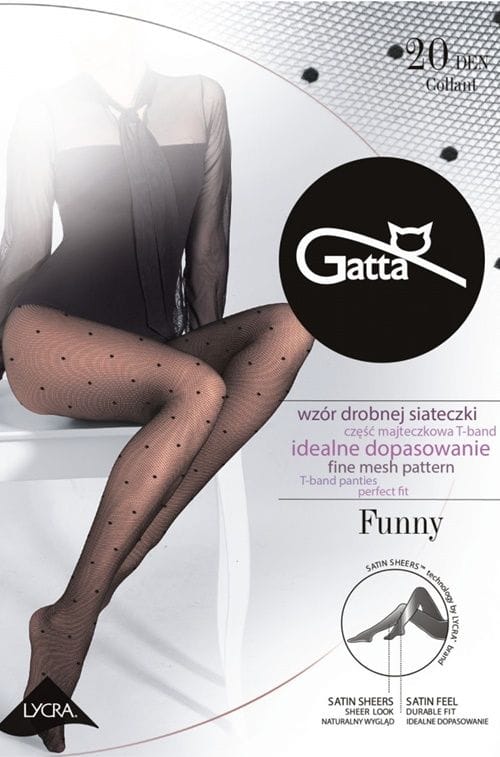 - Funny 05 to delikatne rajstopy w kropeczki, których wzór położono na siateczce. Zapewniają subtelne, równomierne krycie i perfekcyjny, nienaganny, bardzo kobiecy wygląd. Grubość 20 DEN. Skład: 84% poliamid, 16% elastan.