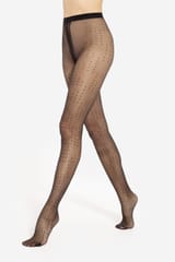 Rajstopy damskie 20 den wykonane z przędzy typu elastan oplatany, matowe, wzorzyste. Delikatne wzmocnienia na palcach, bez zaznaczonej części majteczkowe, mały klin. Skład: 86% poliamid, 14% elastan.
