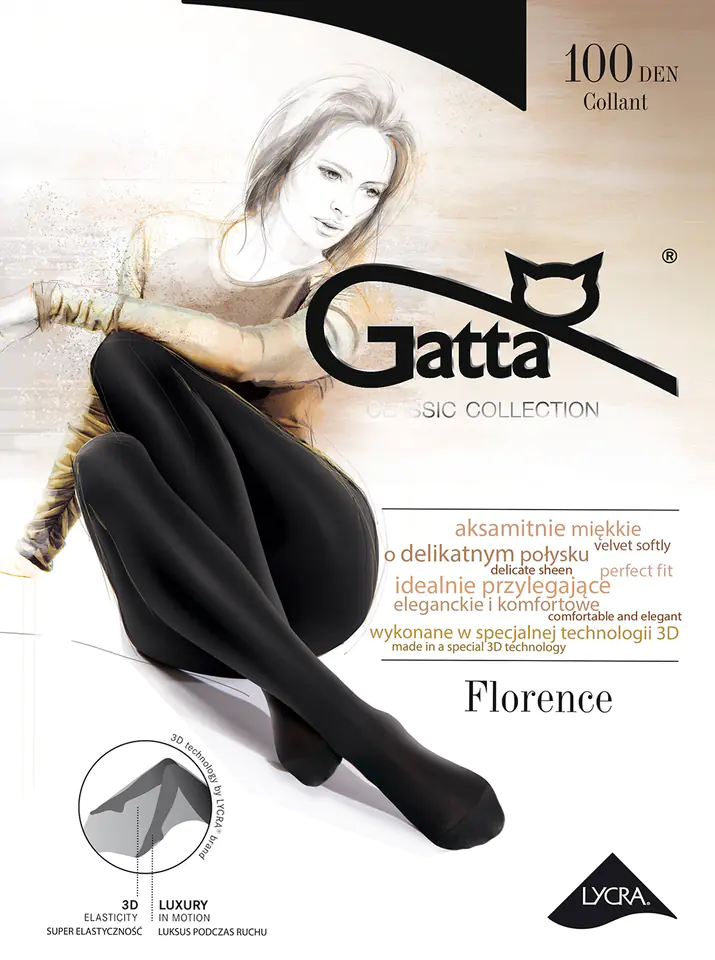 Gatta Florence wykonane zostały w technologi 3D. Co sprawia, że rajstopy te posiadają zwiększoną trwałość oraz delikatny połysk. Wyróżniają się niezwykle miłym i gładkim w dotyku materiałem. Część majtkową typu T-BAND.