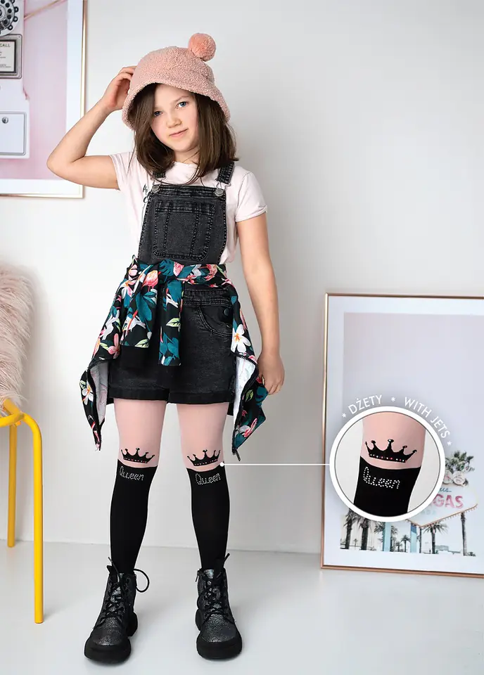 Rajstopy dziewczece 50 den wykonane z mikrofibry ozdobione dżetami. Dzięki użyciu technologii 3D rajstopy są miekkie i dobrze przylegają do nóg.Skład: 89% Poliamid, 11% Elastan.
