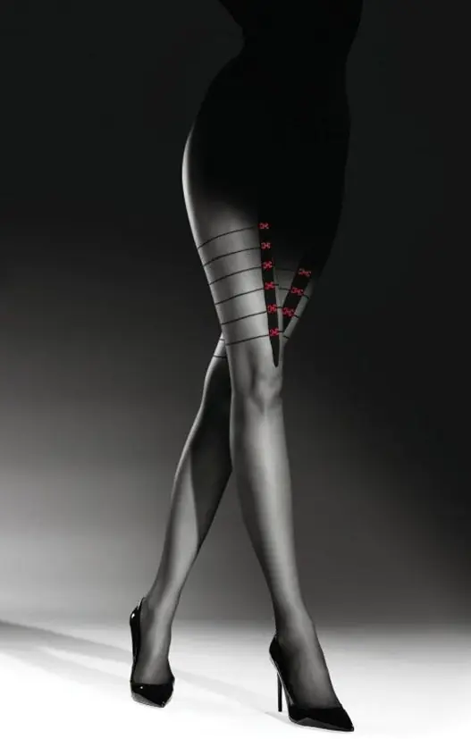 Rajstopy damskie wzorzyste wykonane z przędzy oplatanej typu elastan z wszytym klinem. Skład: 87% Poliamid, 11% Elastan, 1% Bawełna, 1% Polipropylen.