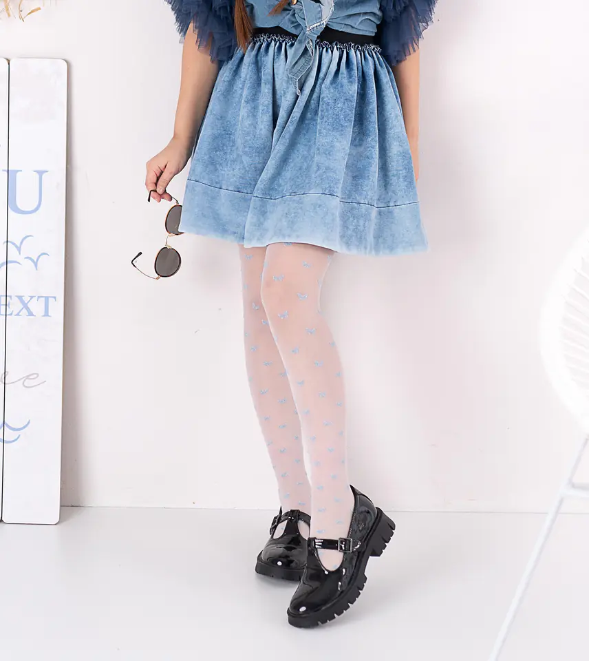 Dziewczęce rajstopy wzorzyste wykonane z przędzy podwójnie oplatanych z dodatkiem przędzy metalizowanej. Wszyty klin. Skład: 78% poliamid,9% elastan, 8% polipropylen,4% poliester,1% bawełna.