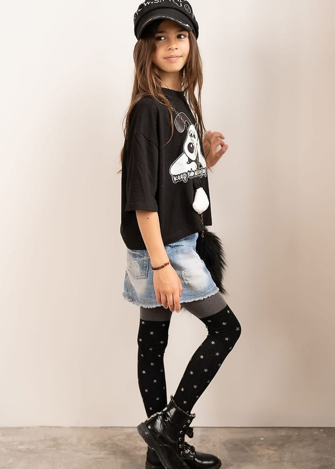 Dziewczęce rajstopy o grubości 50 den wykonane z kryjącej mikrofibry będące imitacją zakolanówek ozdobione printem w srebrne gwiazdki . Skład: 67% poliamid, 7% elastan, 28% poliester.