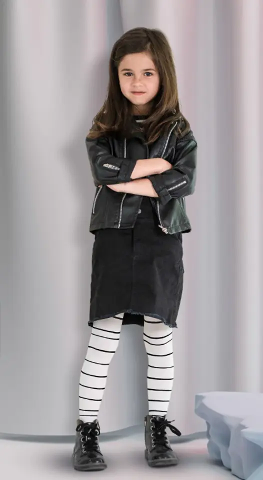 Rajstopy dziewczęce wykonane z miękkiej, kryjącej mikrofibry. Ozdobione kontrastującymi, poziomymi paskami. Skład: 89% poliamid, 11% elastan.