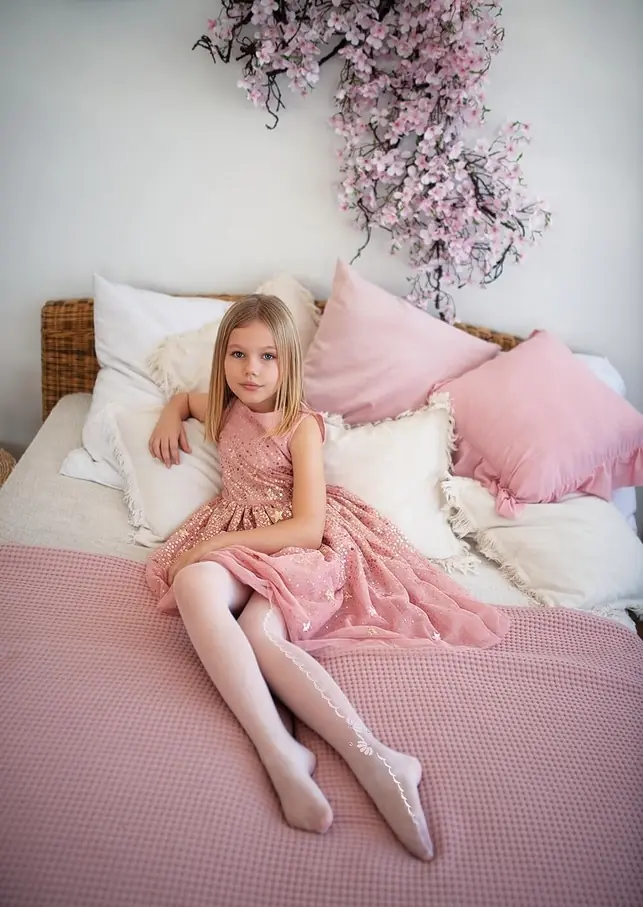 Rajstopy dziewczęce, wzorzyste o grubości 20 den z przędzy oplatanej gwarantującej zwiększoną trwałość. Posiadają płaski szew, mały klin oraz niewidoczne wzmocnienie palców. Skład: 88% poliamid 10% elastan, 1% bawełna, 1% poliester.