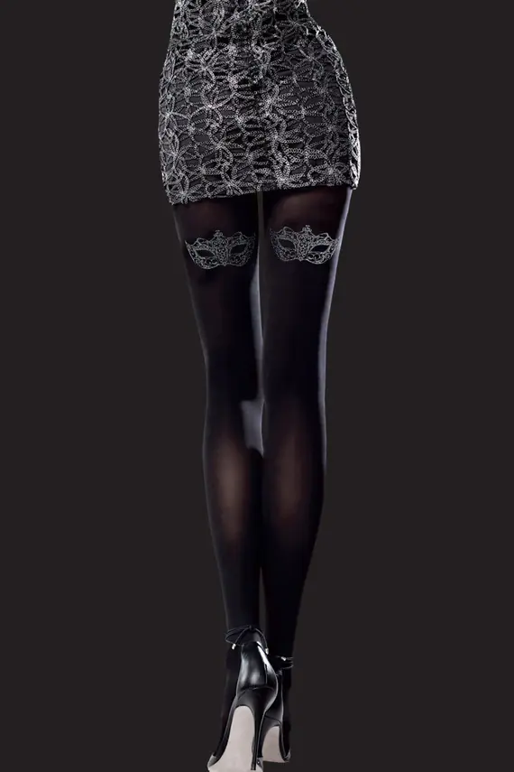 Wzorzyste rajstopy wykonane z mikrofibry 50 den w limitowanej serii. Fantazyjny wzór maski weneckiej z tyłu.
