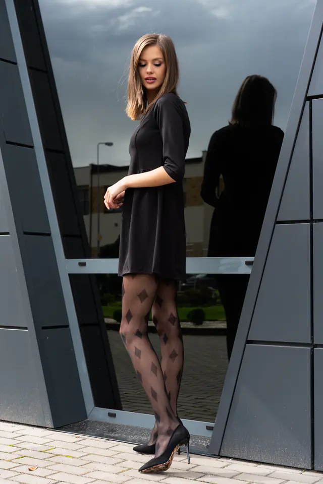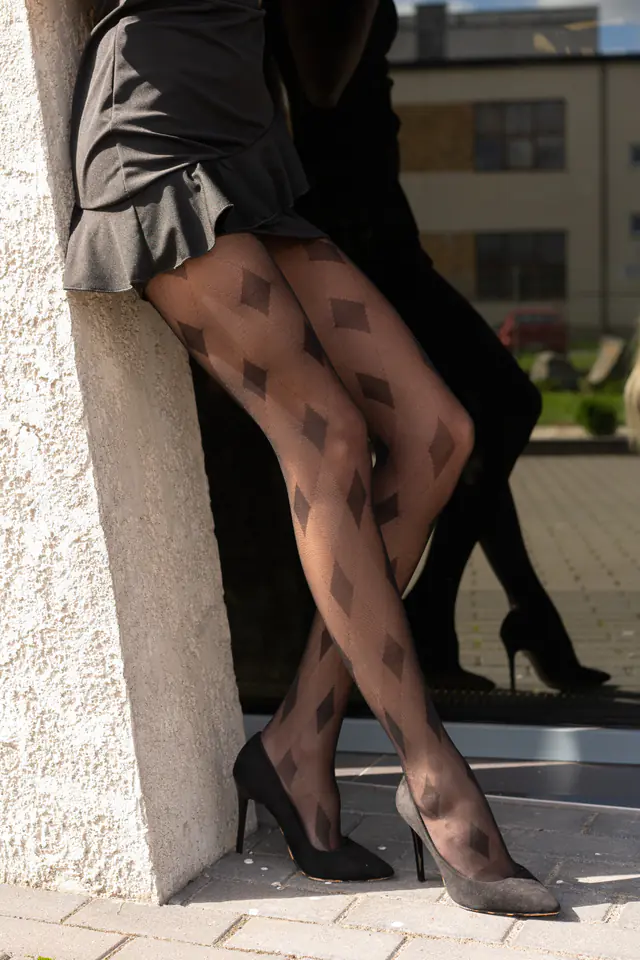 Wzorzyste rajstopy wykonane w technologii 3D z najwyższej jakości przędz oplatanych zapewniających większą wytrzymałość i miękkość oraz efekt lepszego przylegania do nogi. Szyte płaskim szwem dla zwiększenia komfortu noszenia, bez zaznaczonej części majteczkowej i z niewidocznie wzmocnionymi palcami.