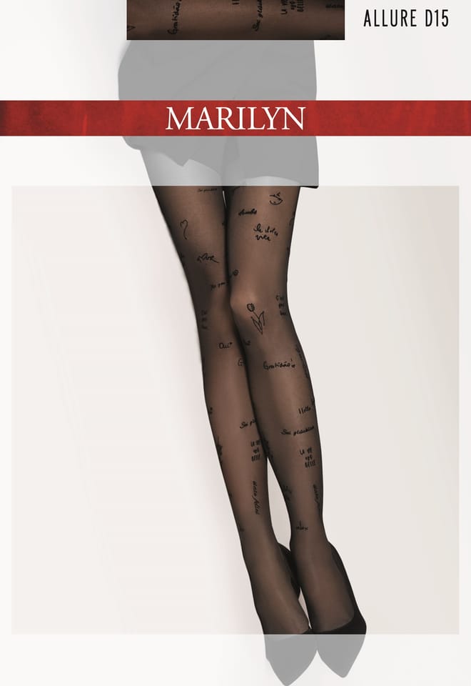Rajstopy damskie o grubości 40 den z elegancko rozmieszczonymi, inspirowanymi kaligrafią napisami.