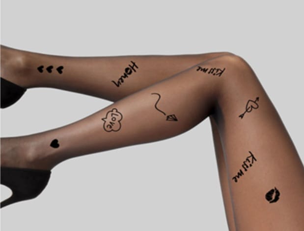Rajstopy o grubości 20 den z nadrukowanymi napisami i grafiką. Posiadają gumkę w pasie oraz niewidoczne wzmocnienie palców. Skład: 89% poliamid, 10% elastan, 1% bawełna