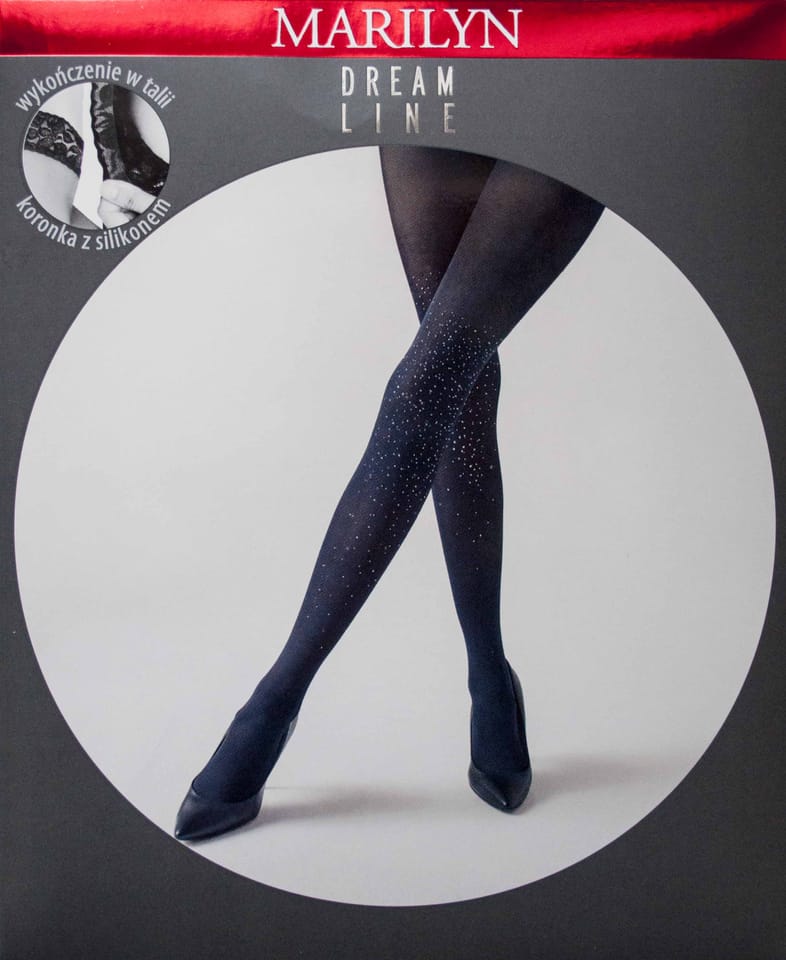 Rajstopy o grubości 60 den zdobione deszczem świecących dżetów. Wykończone w talii koronką z silikonem. Posiadają płaski szew, mały klin oraz niewidoczne wzmocnienie palców. Skład: 91% poliamid, 8% elastan, 1% bawełna