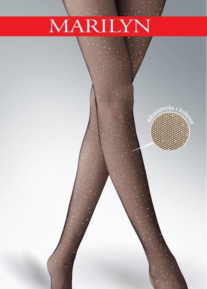 Rajstopy 20Den z delikatnej mikrosiateczki z dodatkiem brokatu tworzą subtelny efekt rozświetlenia i delikatnego migotania na skórze. Połyskujące włókna nadają nogom elegancki, świetlisty wygląd. Skład: 89% poliamid, 10% elastan, 1% bawełna.