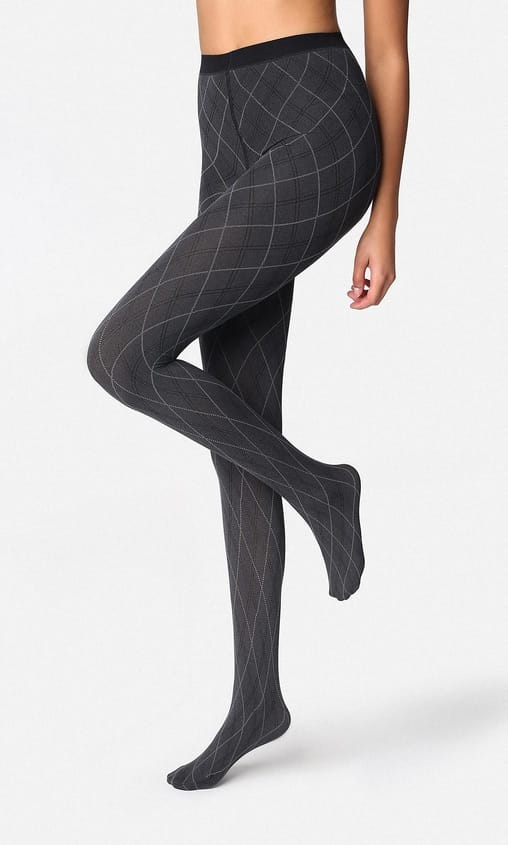 Rajstopy damskie wzorzyste wykonane z mikrofibry w technologii 3D. Posiadają płaski szew, mały klin, wygodną gumkę w pasie i niewidoczne wzmocnienie palców. Skład: 83% poliamid, 16% elastan, 1% bawełna.