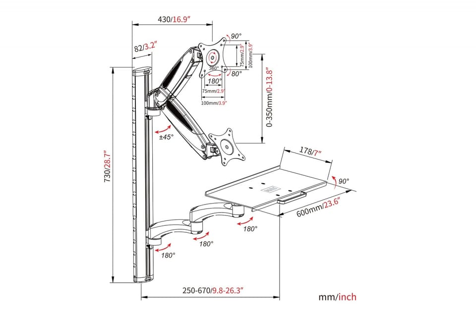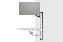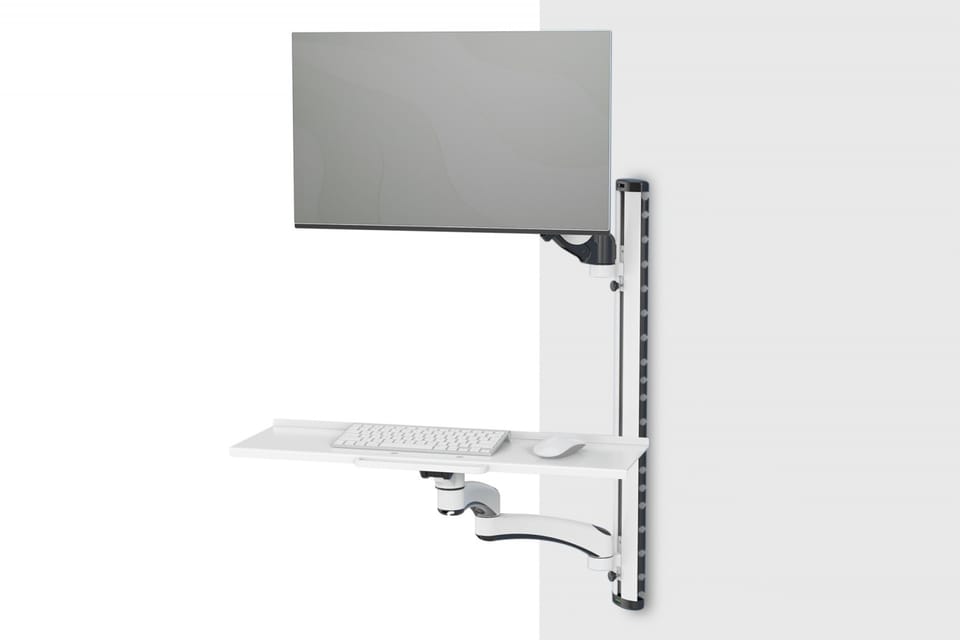 Uniwersalny uchwyt do montażu monitora i klawiatury/myszy na ścianie, z elastyczną regulacją wysokościUchwyt marki DIGITUS umożliwia elastyczną konfigurację miejsca pracy dzięki możliwości montażu ściennego. Półka na klawiaturę i mysz charakteryzuje się maksymalnym obciążeniem 8 kg. Oba ramiona można indywidualnie regulować na wysokość na podstawie wspornika nośnego, który jest montowany na ścianie.
