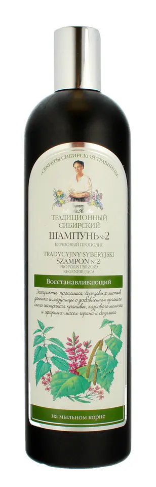 Tradycyjny szampon do włosów nr 2 na bazie propolisu brzozowego oraz organicznego ekstraktu z pokrzywy, olejów z żeń-szenia i wrzosu silnie regeneruje zniszczone i osłabione włosy intensywnie odżywia włosy i nawilża je, dzięki czemu przywraca ich witalność i piękno.