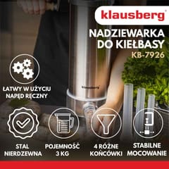 Model KB-7926 to niezawodne rozwiązanie dla osób, które chcą przygotować własne, zdrowe i smaczne kiełbasy w domowych warunkach. Dzięki solidnej konstrukcji i pojemności 3 kg sprawdzi się zarówno przy okazjonalnym, jak i częstszym użytkowaniu.