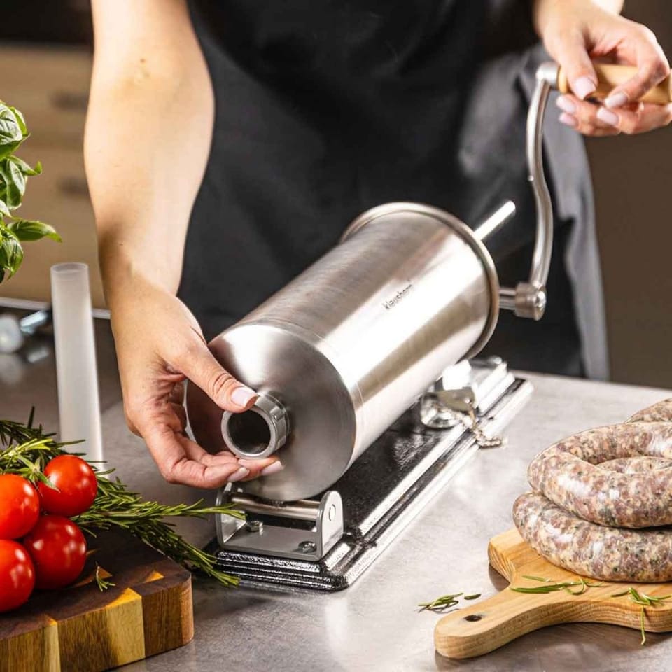 Pozioma nadziewarka do kiełbas Klausberg KB-7928 to praktyczne i solidne urządzenie stworzone z myślą o miłośnikach domowych wyrobów. Wykonana z wysokiej jakości stali nierdzewnej, zapewnia trwałość, higienę i łatwe czyszczenie. Dzięki pojemności 3 kg świetnie sprawdzi się zarówno do przygotowania mniejszych partii, jak i większej ilości kiełbas, kabanosów czy innych wyrobów mięsnych. Pozioma konstrukcja gwarantuje stabilność podczas pracy, a mocne mocowanie i ręczna korbka z drewnianym uchwytem sprawiają, że obsługa jest wygodna i bezpieczna.