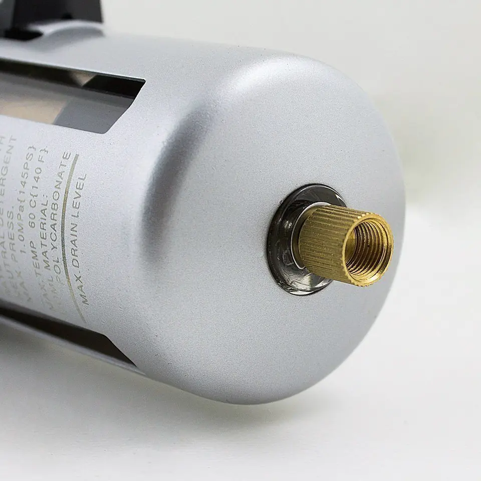 Oferowanym produktem jest filtr powietrza z manometrem i reduktorem z gwintami 1/4" o bardzo trwałej konstrukcji. Posiada odkręcany wieszak do mocowania na ścianie, blokadę regulatora (góra-dół). Jest niezbędnym elementem w instalacjach pneumatycznych 1/4". Wbudowany filtr osusza, jak i separuje olej czy inne zanieczyszczenia. Wodę ze zbiornika opróżniamy pociągając zawór u dołu filtra. Stosując filtr zabezpieczamy urządzenia przed rdzewieniem i uszkodzeniem. Filtr jest również obowiązkowym elementem dla lakierników.