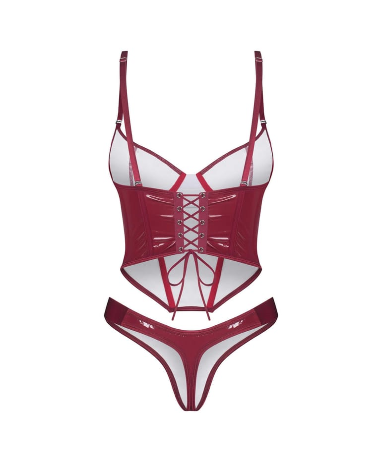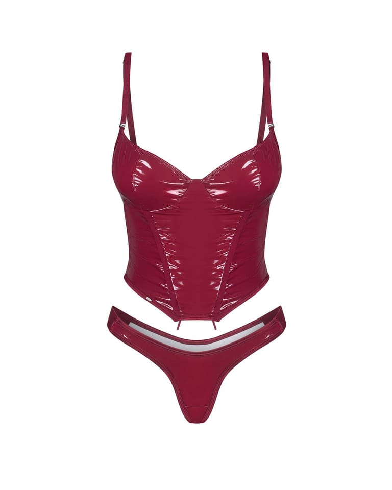 Błyszczący komplet z modelującymi przeszyciami i sznurowaniem z tyłu, które pozwala idealnie dopasować gorset do sylwetki.Połyskujące, lakierowane wykończenie nadaje całości odważnego i niezwykle zmysłowego charakteru.Miękkie miseczki zapewniają komfort noszenia, a regulowane ramiączka umożliwiają indywidualne dopasowanie.Dopasowane stringi dołączone do zestawu doskonale uzupełniają całość, tworząc spójny i kuszący look.Komplet został zaprojektowany w UE z dbałością o detale i estetykę.Skład: materiał 1 – 100% poliuretan, materiał 2 – 95% poliester, 5% elastan.Uwaga: produkt nieodpowiedni dla dzieci poniżej 3 roku życia.Istnieje ryzyko zadławienia z powodu małych elementów, które mogą zostać odłączone.