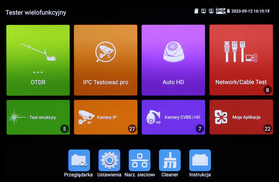 Reflektometr optyczny (OTDR) wraz z wielofunkcyjnym testerem kamer AHD, HD-CVI, HD-TVI, IP posiadający wiele dodatkowych funkcji, niezbędnych przy uruchamianiu instalacji CCTV i światłowodowych